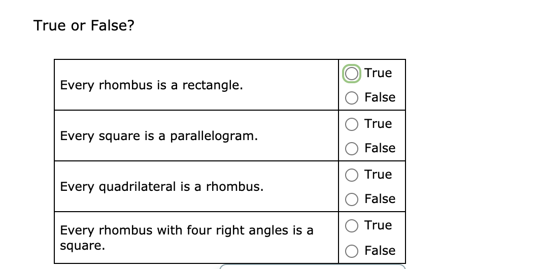 True Every rhombus is a rectangle. Every parallelogram is a rhombus. False True Every rhombus with four right angles is a square.